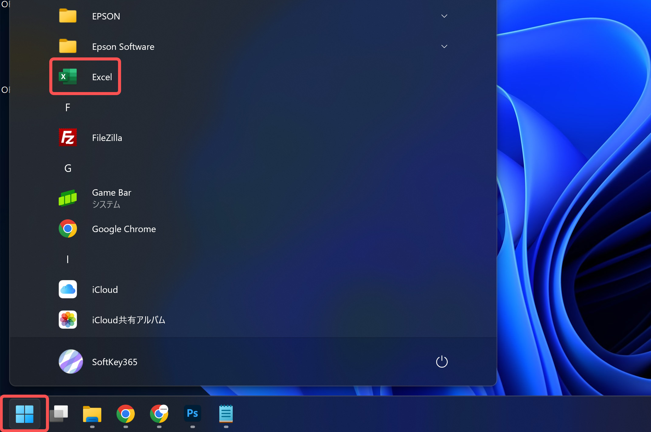 1-1. タスクバー左はしの[スタート]をクリックして、表示されたメニューから「Excel」などの Office アプリを選んで開いてください。
