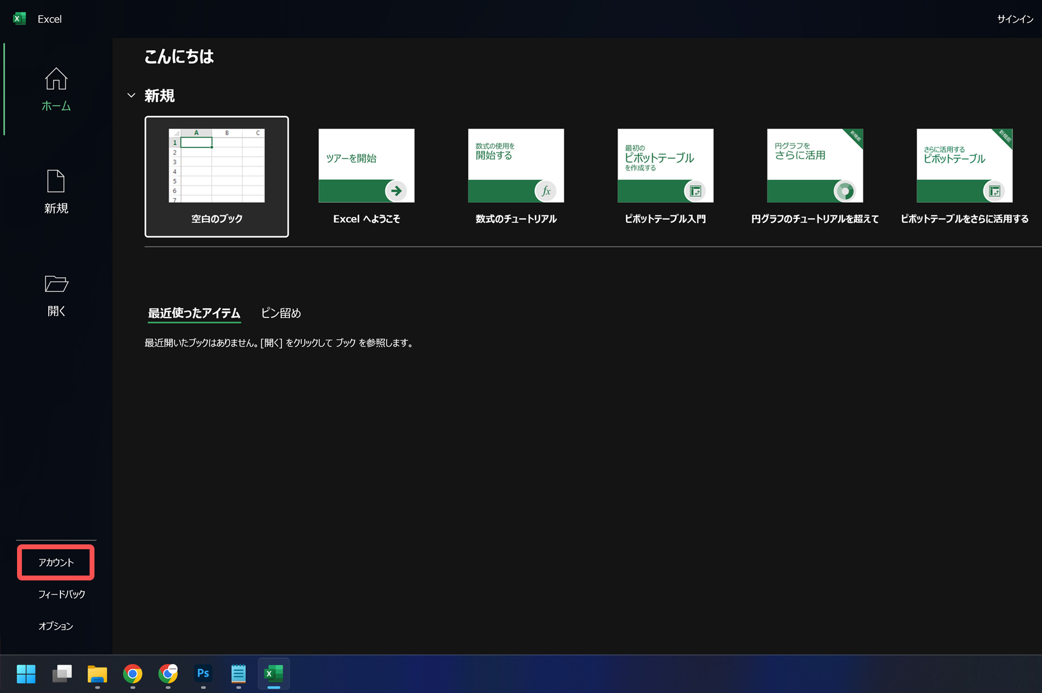 1-2. Excel を開いたら、画面左下にあるメニューから[アカウント]をクリックしてください。