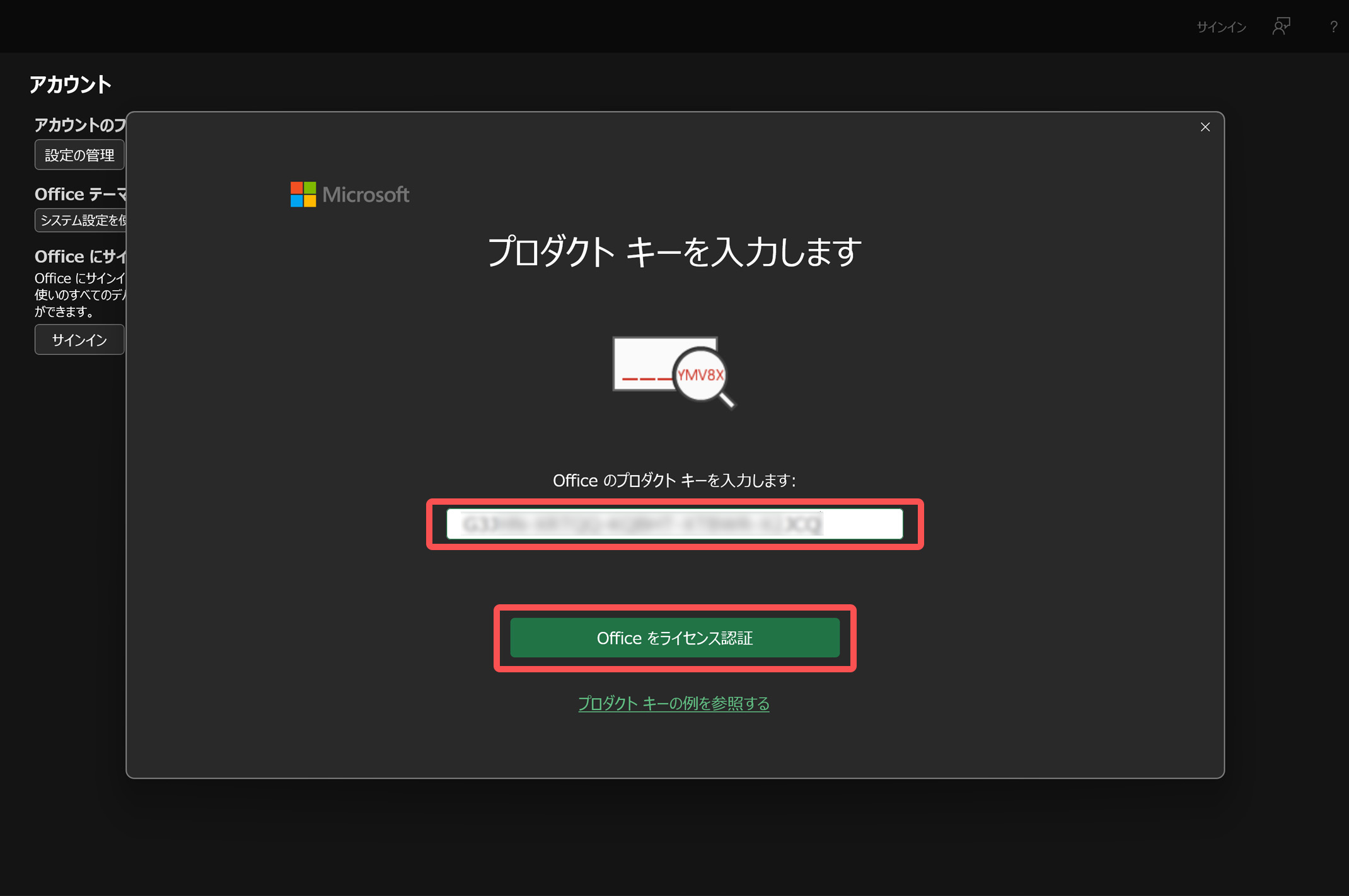 1-4. [プロダクトキーを入力します]と表示されたら、入力欄にご購入いただいたプロダクトキーを入力してください。その後、[Office をライセンス認証]ボタンをクリックしてください。