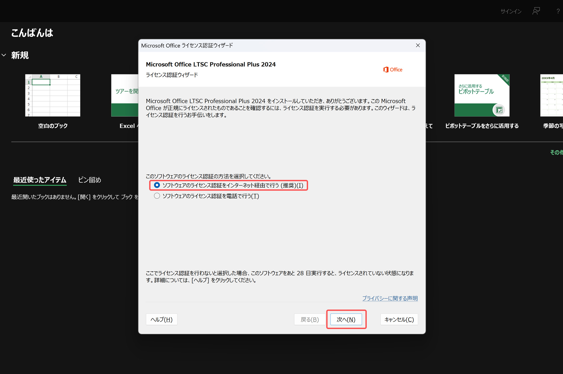 認証方法の選択画面が表示されたら、[ライセンス認証をインターネット経由で行う(推奨)]を選んで、[次へ]をクリックしてください。