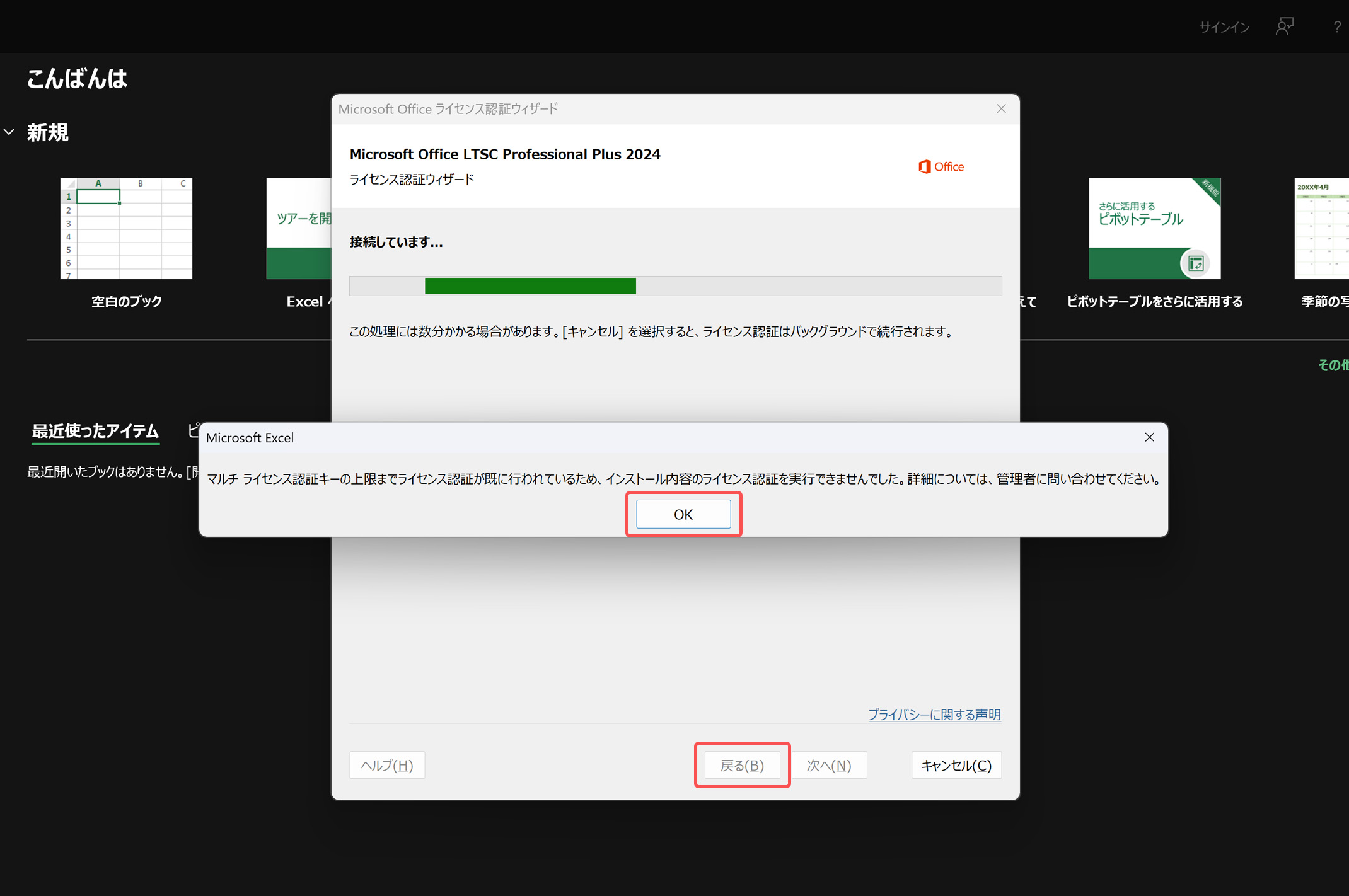 「ライセンス認証の回数が上限に達しているため、認証できません」と表示された場合は、電話認証を行う必要があります。そのときは、[OK]をクリックしてから[戻る]をクリックしてください。