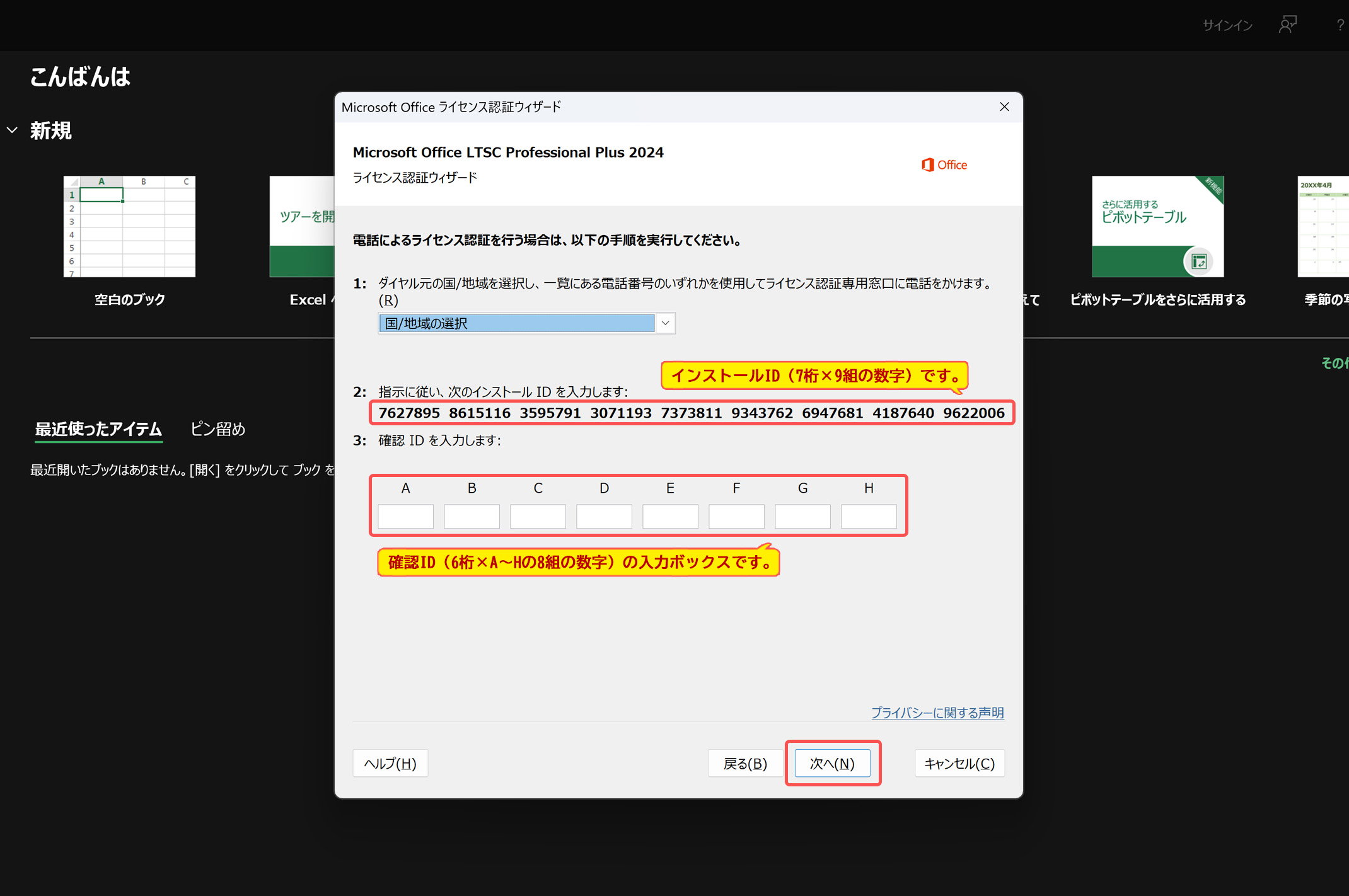 ライセンス認証の方法を選択する画面に戻り、[ライセンス認証を電話で行う]を選んで、[次へ]をクリックしてください。