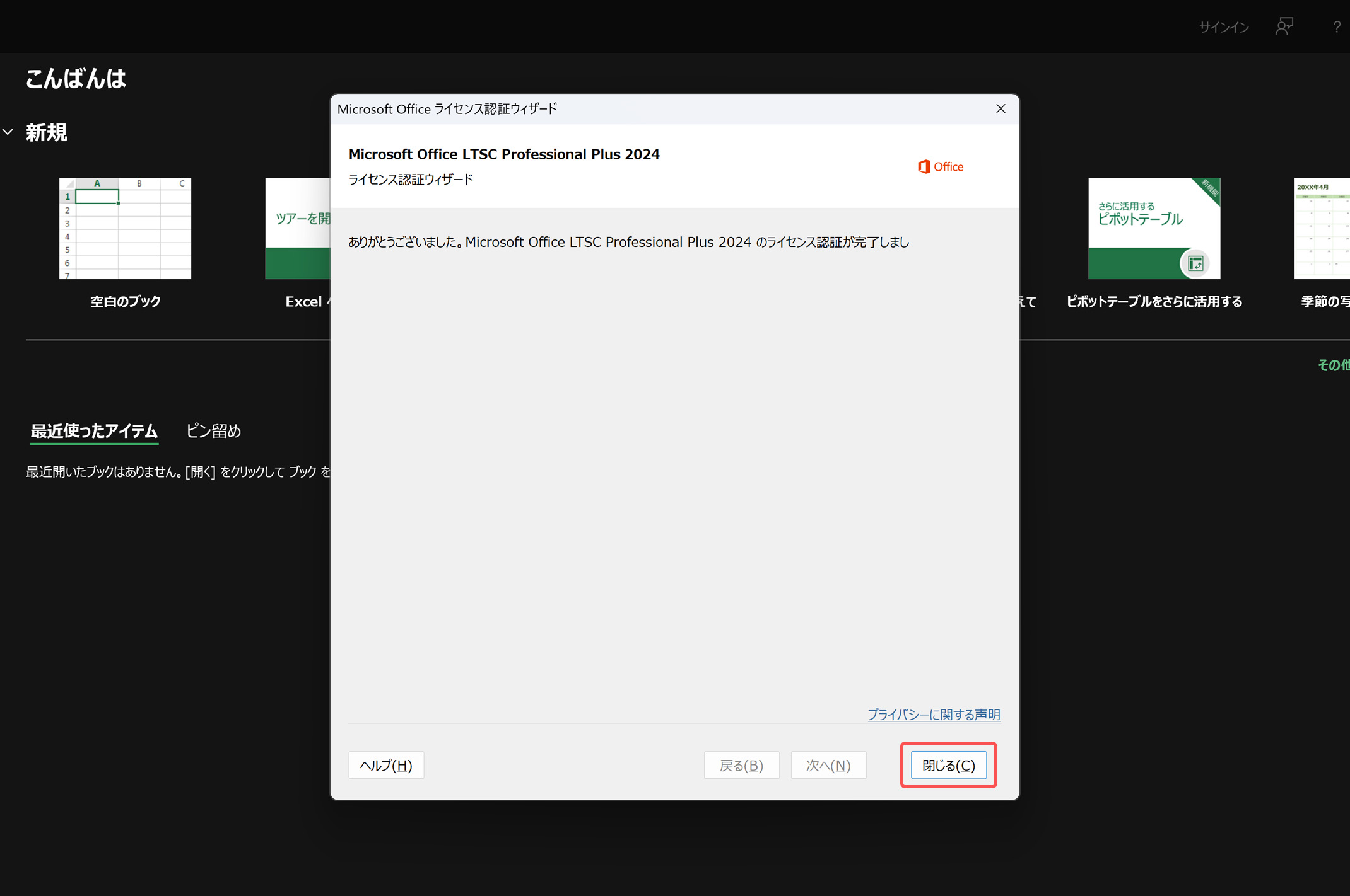 1-6. 「おめでとうございます。…認証が完了しました。」と表示されたら、[閉じる]ボタンをクリックして作業を終了してください。ここではじめて認証が完了し、すべてのOffice製品が正しくライセンス認証されます。