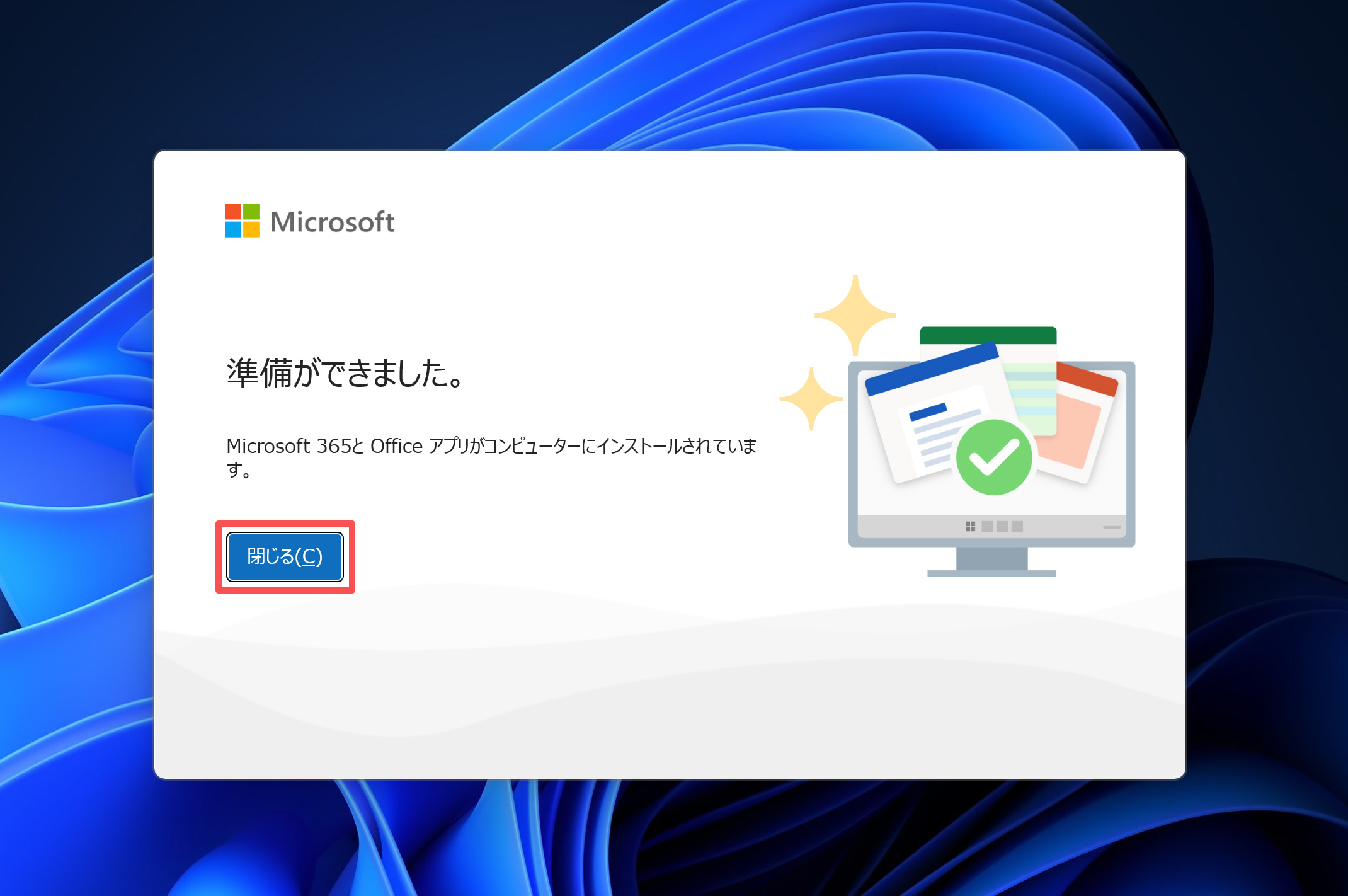 「準備ができました。」と表示されたら、[閉じる]をクリックして完了です。