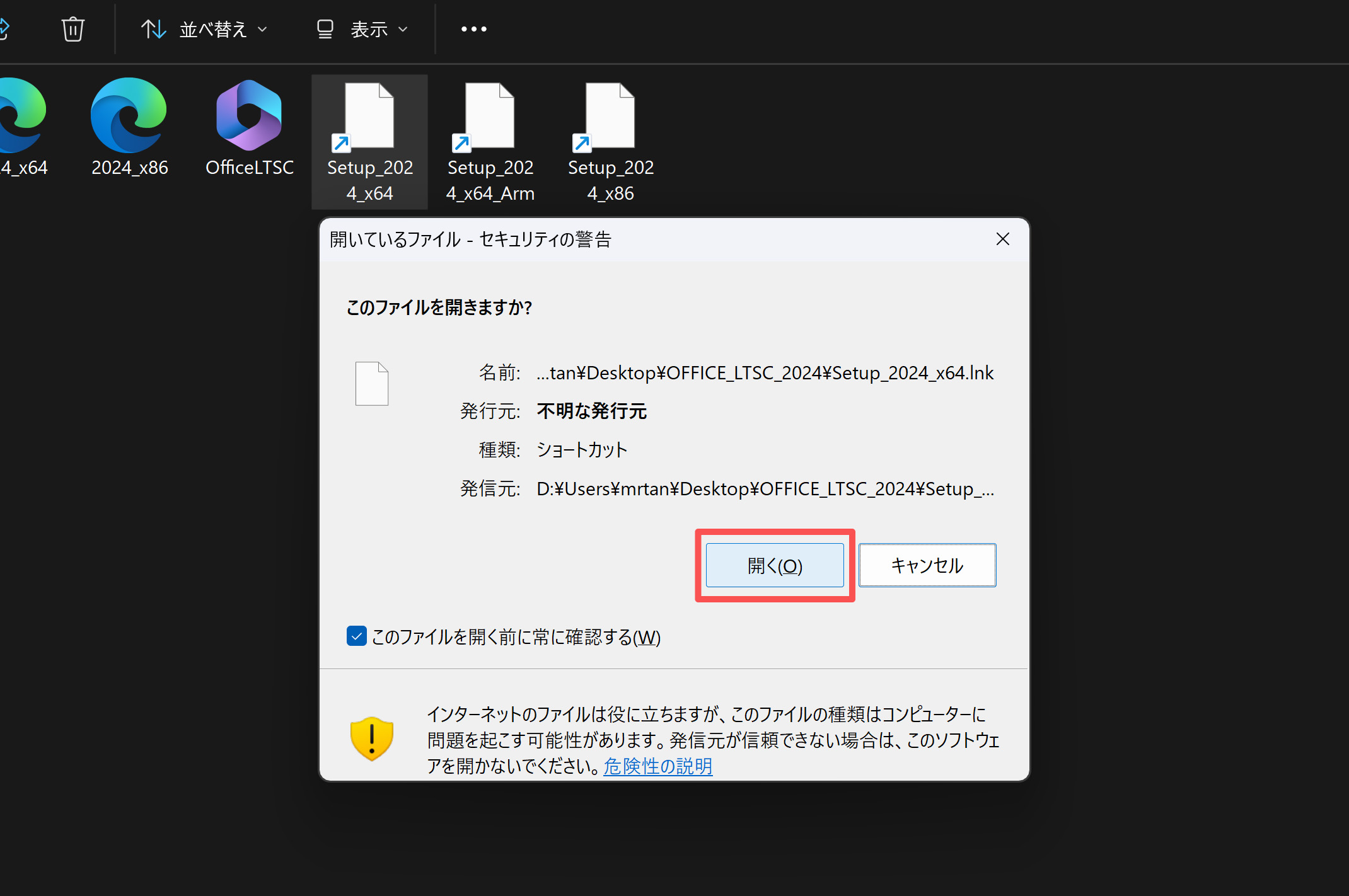 下記の画面「開いているファイル – セキュリティの警告」が表示されたら、[開く]をクリックして続行してください。