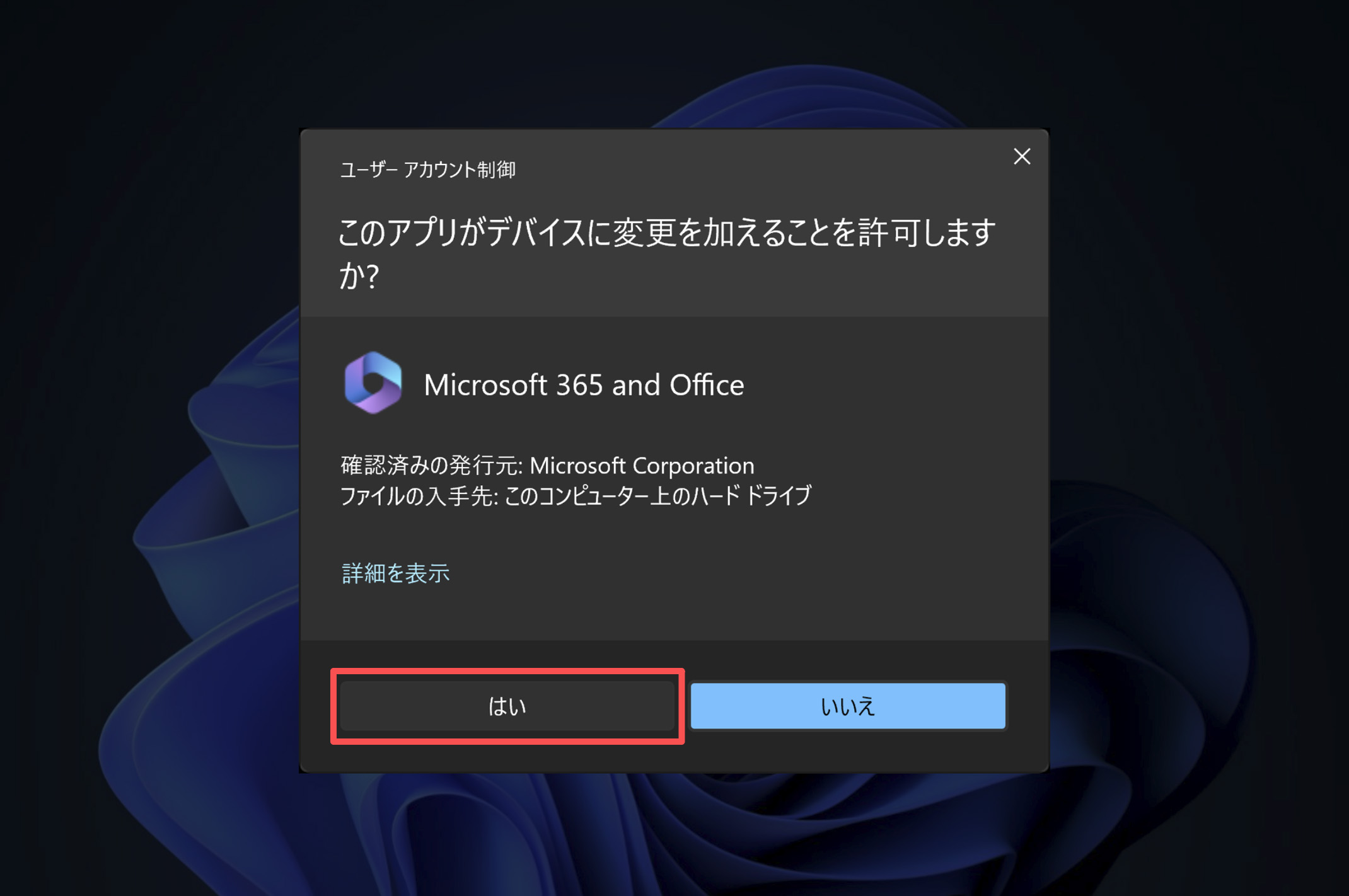 下記の画面「このアプリがデバイスに変更を加えることを許可しますか?」が表示されたら、[はい]をクリックします。その後、必要ファイルのダウンロードとインストールが自動で進みます。
